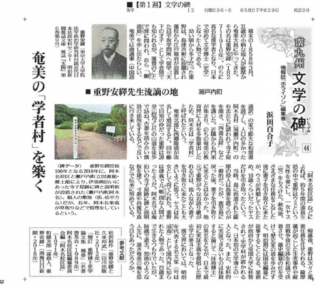 幕末の1858年3月、31歳の小柄な流人が薩摩から奄美大島にやってきた。その名は重野安繹(やすつぐ・1827〜1910)。のちに高名な漢学者となり、日本で初めて文学博士(史学)となった人物である。
